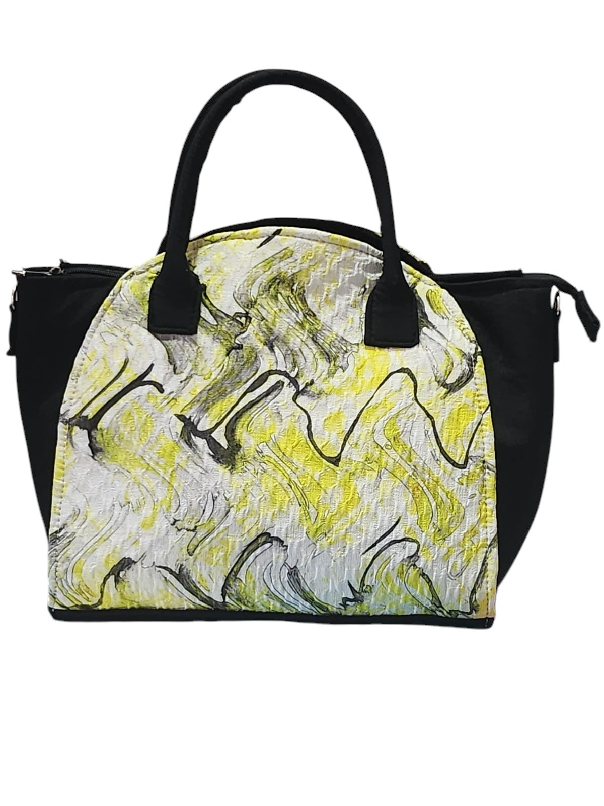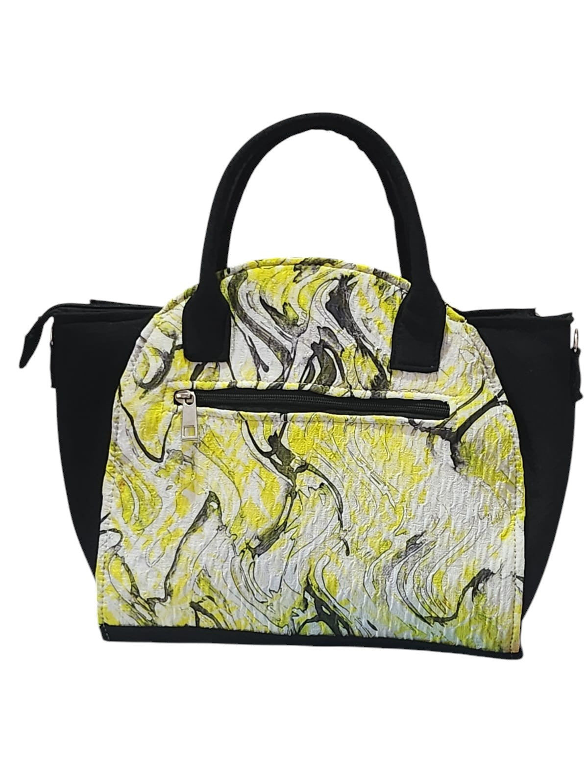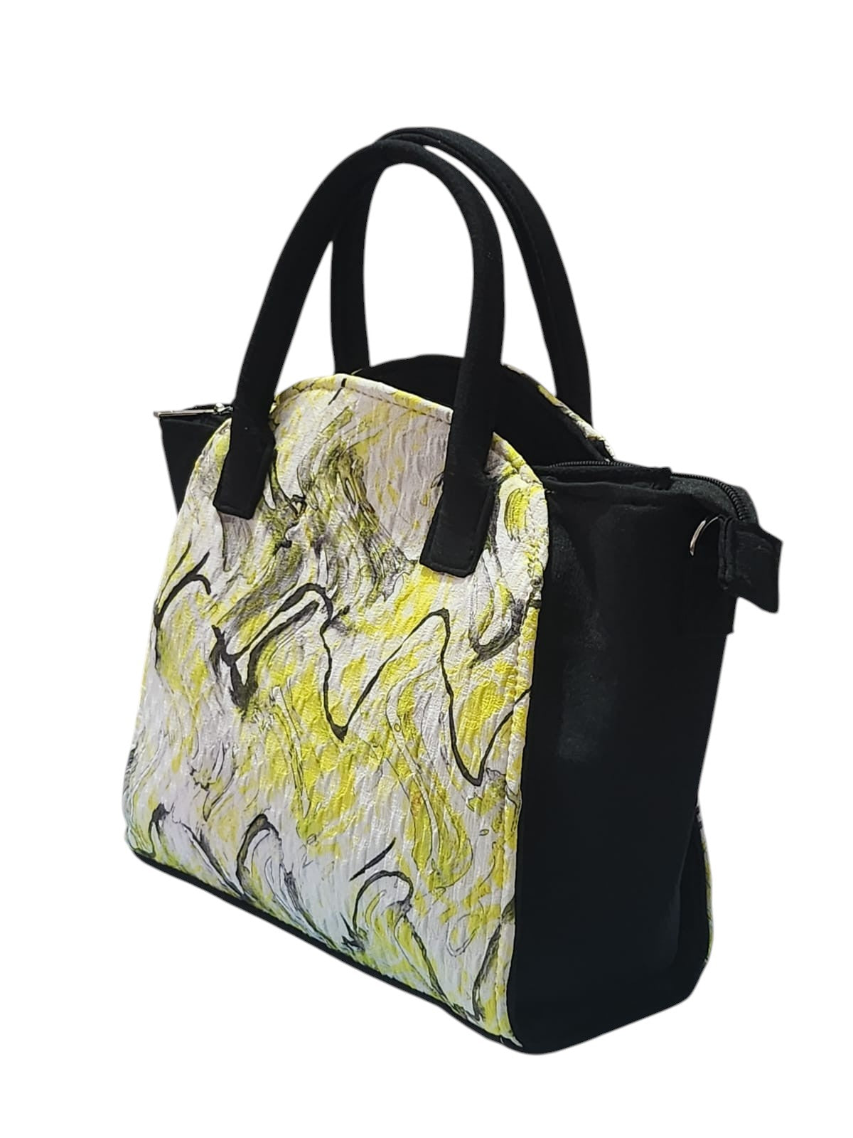 Illuminate your style with the Midnight Sun Clutch, a statement piece that combines artistic elegance with modern functionality. This embroidered tote handbag for women showcases a striking Midnight Sun design, blending bold strokes of yellow, black, and white for a radiant, fashion-forward appeal.